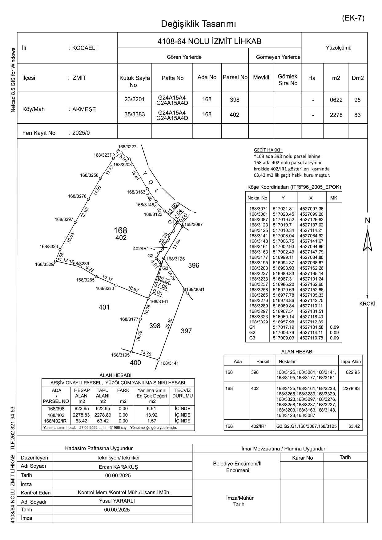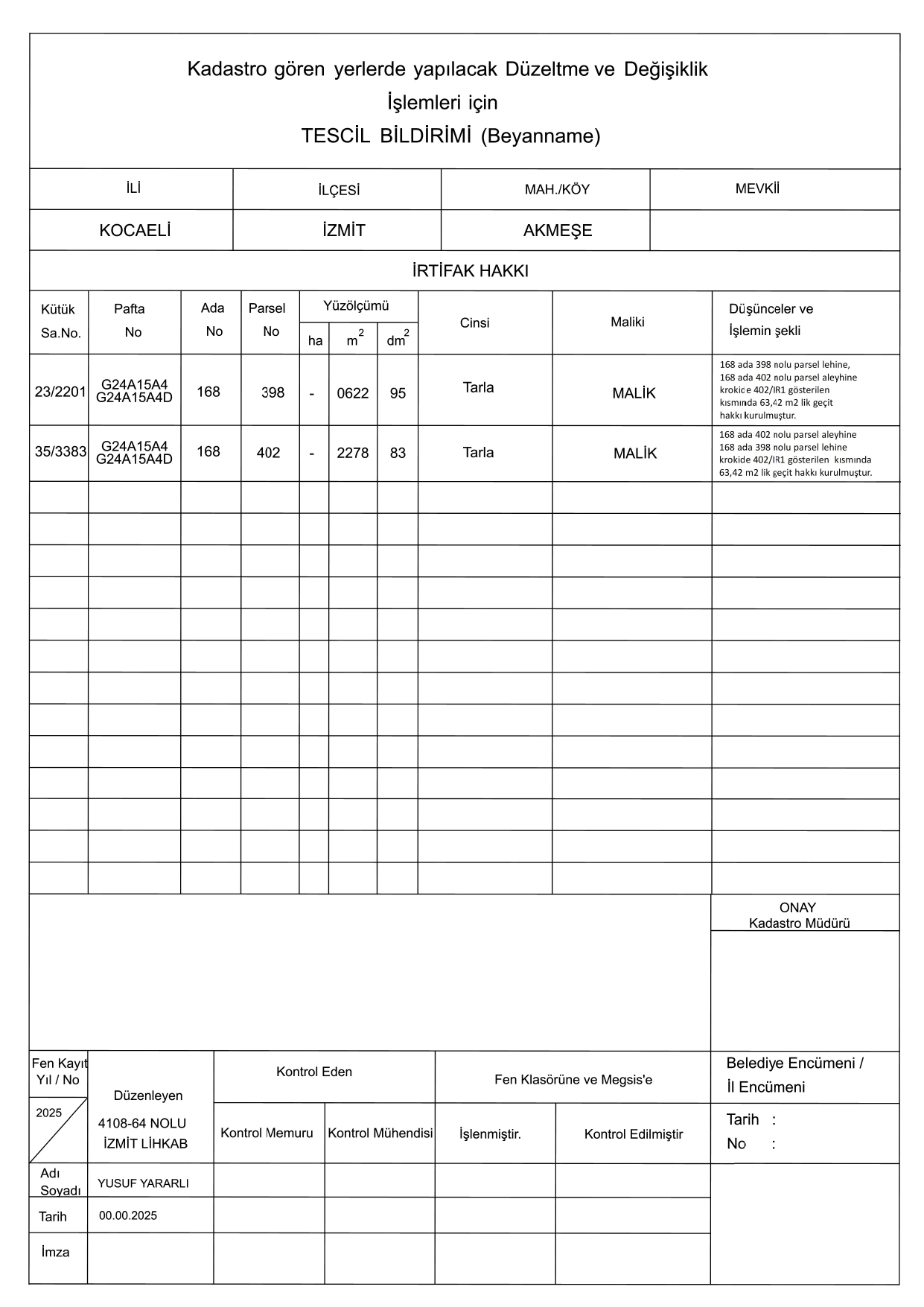 2. İrtifak hakkı güzergâhını belirten projenin istenmesi veya irtifak hakkı güzergâhının ilgililerince zeminde işaretlenmiş olması zorunludur, (Lehine ve aleyhine irtifak hakkı tesis edilecek taşınmaz malın maliklerinin talep anında hangi parsel lehine, hangi parsel aleyhine irtifak hakkı tesis edileceğini açıkça belirtmeleri zorunludur.)